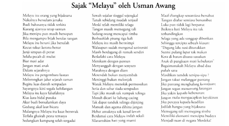 Suram menyerak terukir di langit tua. Banjar juga disebut melayu, minangkabau memang melayu, keturunan acheh adalah melayu memiliki ekonomi mencipta budaya. Usman awang mula mencipta nama dalam dunia persuratan melayu moden dengan penulisan sajak. Sajak yang indah nukilan usman awang. Download lagu sajak melayu usman awang mp3 dapat kamu download secara gratis di metrolagu.
