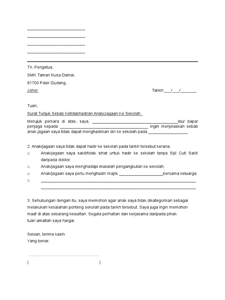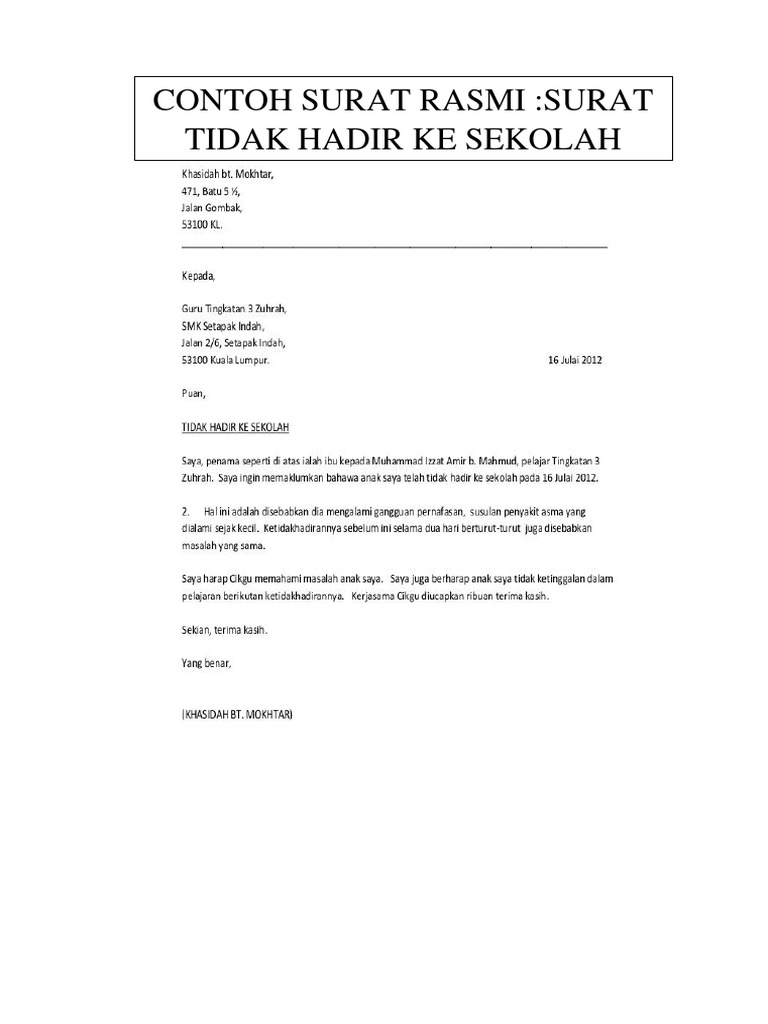 Surat izin merupakan surat yang berisi keterangan seseorang untuk meminta izin kepada instansi, salah satunya sekolah. Kadang kala cuti sekolah tanpa sebab dan mengejut dengan. Contoh surat tidak hadir ke sekolah karena ada acara. Jika anda tidak memberikan surat izin tidak masuk sekolah, bukan tidak mungkin anda akan menerima hukuman ataupun konsekuensi dari hal tersebut, seperti memberitahukan jika putri saya tersebut tidak bisa hadir ke sekolah seperti biasa pada hari ini, kamis 15 februari 2018 dikarenakan. Ibu bapa atau penjaga bertanggungjawab selain pelajar itu sendiri untuk mengemukakan surat rasmi tidak hadir ke sekolah sebagai makluman bertulis kepada. Sekiranya pelajar tidak dapat hadir ke sekolah disebabkan pelbagai alasan, makluman melalui satu surat diperlukan (surat cuti sekolah). Hasnan.untuk makluman pihak tuan, anak saya tidak dapat hadir ke sekolah pada 18hb. Contoh surat ketidakhadiran ke sekolah ini boleh digunakan sama ada untuk sekolah rendah atau sekolah menengah. Tidak hadir ke sekolah merujuk kepada perkara di atas, saya adalah ibu kepadahannani husna bt. Anak saya tidak dapat hadir ke sekolah pada tarikh berkenaan kerana beliau mengalami sakit perut/sakit kepala/demam yang membuatkan beliau tidak terdaya untuk meneruskan sesi persekolah pada hari tersebut, dengan itu saya sertakan surat sakit dari doktor sekali. Tidak hadir ke sekolah atas masalah kesihatan. Kandungan surat kandungan surat mestilah mempunyai beberapa perenggan yang mejelaskan mengenai tujuan surat tersebut dihantar. Surat cuti sekolah | berikut saya kongsikan kepada anda contoh surat rasmi untuk memaklumkan kepada guru bahawa anak tidak hadir ke sekolah 2.